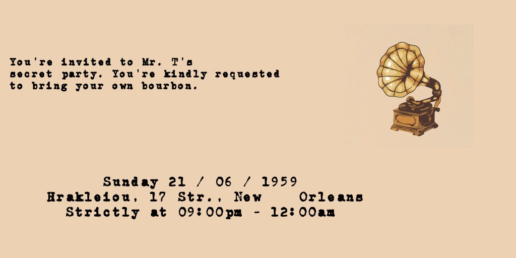Η Lil Green με την απαλή της φωνή στο Why Don’t You Do Right, που έπαιζε από ηχεία που δεν φαίνονταν στο χώρο, κάλυπτε τις ομιλίες των τεσσάρων ανδρών που είχαν βρεθεί τόσο παράξενα εκεί και προσπαθούσαν να γνωριστούν και να καταλάβουν γιατί παρευρίσκονταν σε εκείνη τη μάζωξη. Το φως είχε πλέον χαθεί ολοκληρωτικά από τον ουρανό και η νυχτερινή δροσιά έδινε τη θέση της στην αφόρητη ζέστη που είχε πλακώσει την πόλη τις προηγούμενες ώρες. Η κουβέντα είχε επεκταθεί σε θέματα που αφορούσαν τον κινηματογράφο, σε διάφορα στοιχεία και γεγονότα για την πόλη της Νέας Ορλεάνης, στα αγαπημένα ποτά του καθενός. Περισσότερο προσωπικά, και μάλλον περισσότερο επικίνδυνα, στοιχεία αποφεύγονταν, κάνοντας όλο αυτό να μοιάζει με μια πραγματική παρτίδα πόκερ.